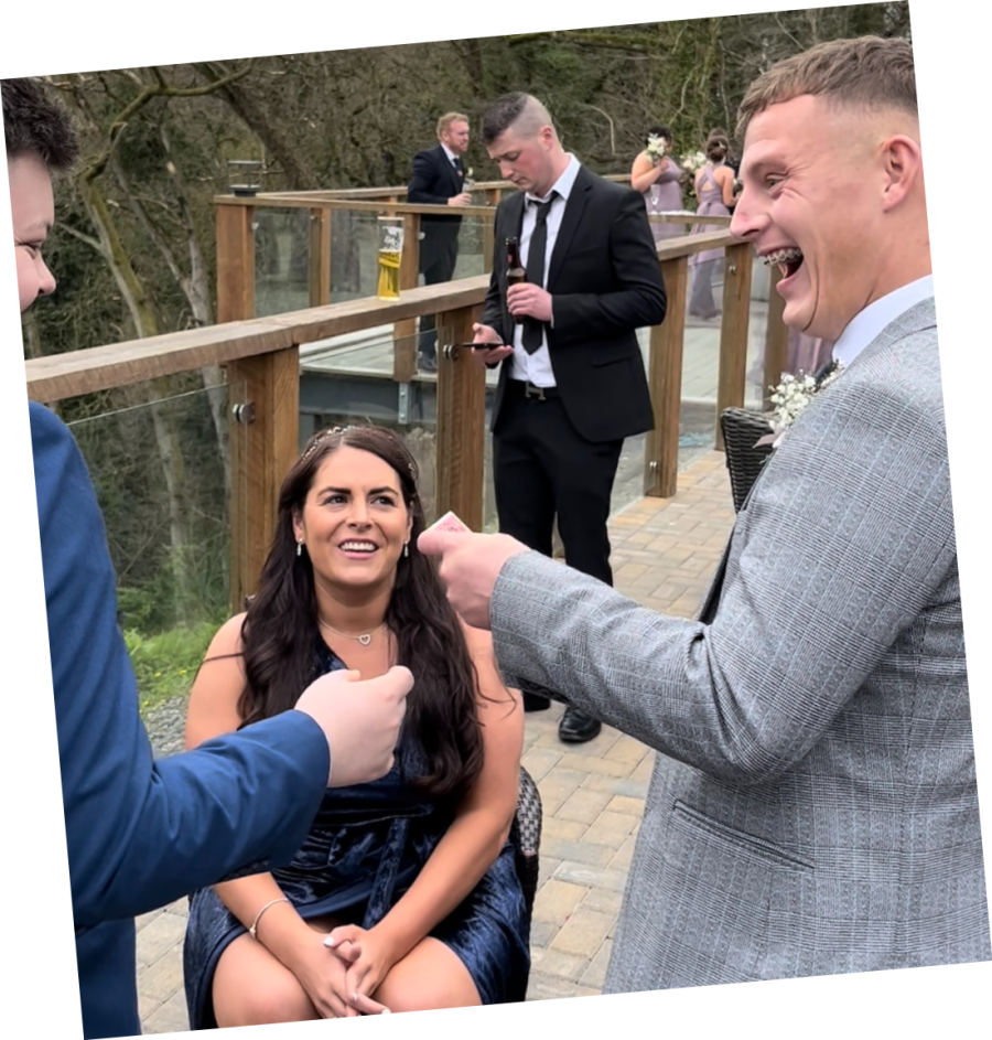 As well as this, he helps to seamlessly bridge the gap during the quieter portions of your day when some of your guests may feel disconnected and unsure of what to do or where to go. Such as between the ceremony and the wedding breakfast and the room turnaround and evening reception. These times are perfectly suited for Campbell's close-up entertainment to keep your guests engaged, settled and involved.